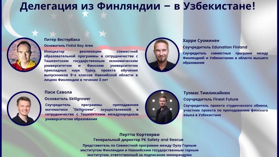 В течение семи дней Государственной инспекцией по надзору за качеством образования, Агентством по делам молодежи, хокимиятами Навоийской, Бухарской и Самаркандской областей и должностными лицами системы образования планируется провести переговоры по обмену студентами, совместными образовательными программами, проектами по изучению математики и финских языков.