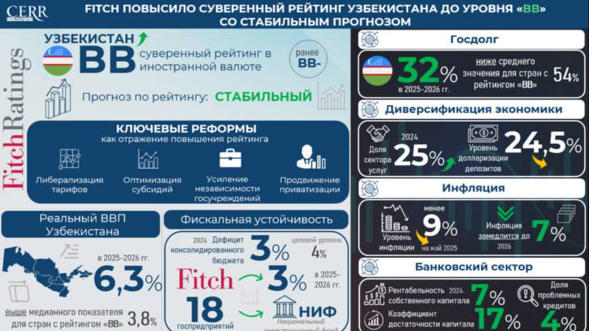 По данным агентства, реальный ВВП Узбекистана вырастет на 6,3% в 2025 и 2026 годах, что значительно выше медианного показателя для стран с рейтингом «BB» (3,8%).