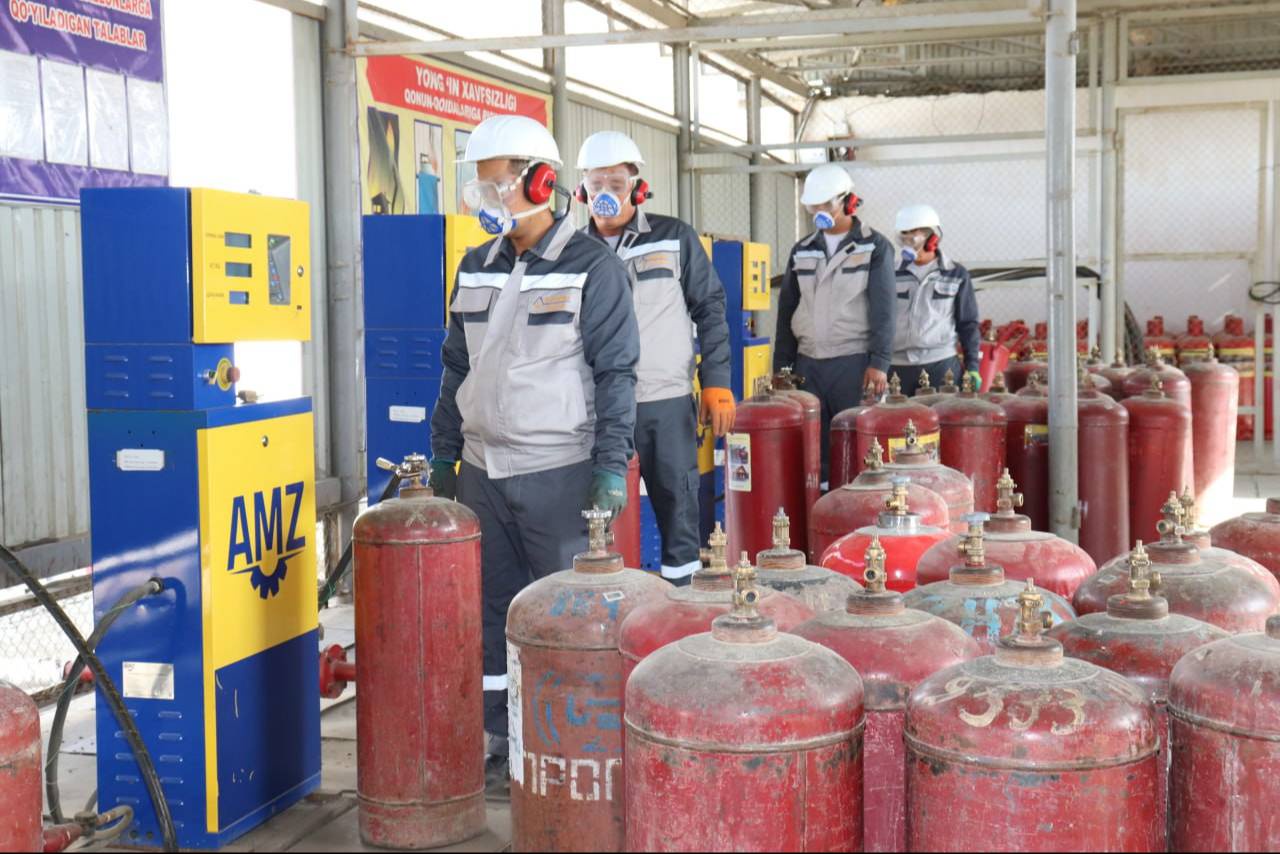 На газозаправочном пункте «Навбахор», который доставляет сжиженный газ в бытовых газовых баллонах потребителям Навбахорского, Карманинского, Кызылтепинского и Канимехского районов области, работа в полном разгаре. В пункте бытовые газовые баллоны сначала очищают от тяжелых остатков, а затем каждую емкость наполняют газом в установленном объеме и помещают в транспортные средства.
