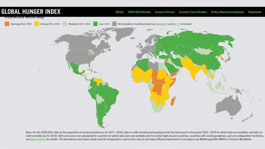 Место каждой страны в рейтинге определяется путем суммирования следующих показателей - доля недоедающего населения, доля детей в возрасте до пяти лет с недостаточным весом, доля детей в возрасте до пяти лет которые отстают в росте, а также уровень смертности детей в возрасте до пяти лет.