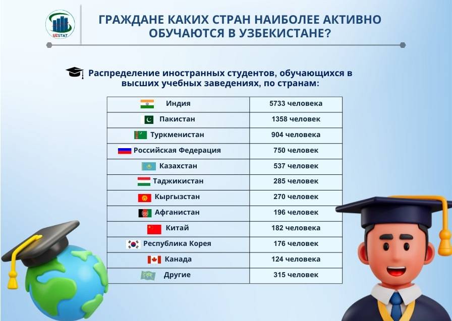 По данным Агентства статистики, распределение иностранных студентов, обучающихся в высших учебных заведениях, по странам:
