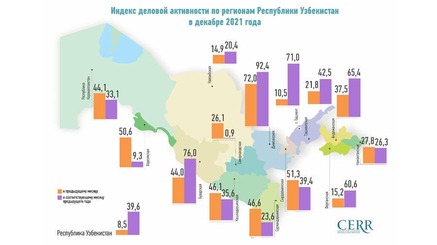 В декабре 2021 года Индекс деловой активности по всем регионам увеличился, по сравнению с предыдущим месяцем. В Джизакской (72,0%), Сырдарьинской (51,3%), Хорезмской (50,6%), Сурхандарьинской (46,6%) и Кашкадарьинской (46,1%) областях наблюдался значительный рост.
