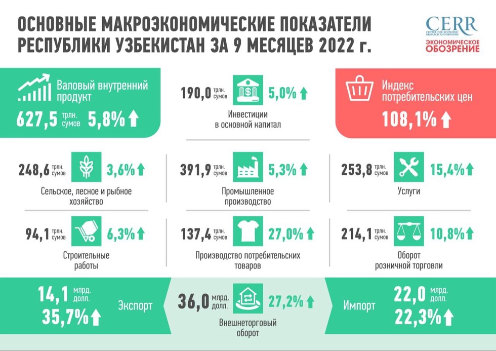 В целом экономика Узбекистана по итогам 9 месяцев 2022 г. продолжает сохранять положительную динамику несмотря на усиление внешних вызовов. Повышенная волатильность цен на глобальных товарных рынках, нарушение логистических цепочек поставок отражаются в виде ускорении инфляции в стране.