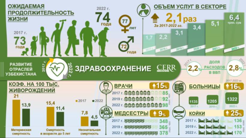 За 2017-2022 годы, в секторе отмечается позитивная динамика роста. Так, за последние шесть лет объем услуг в сфере здравоохранения увеличился в 2,1 раза, с 1,7 трлн сумов до 6,4 трлн сумов.