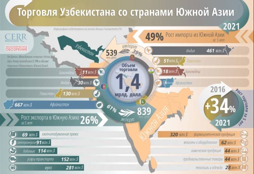 Общий объем внешней торговли Узбекистана со странами Южной Азии в 2021 г. составил $1,4 млрд или 3,3% от общего объема внешней торговли. Рост экспорта Узбекистана в страны Южной Азии за 5 лет составил 26%, а импорта - 49%.