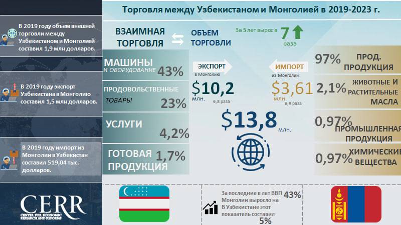 За этот период экспорт Узбекистана в Монголию увеличился в 6,8 раза с 1,5 млн долларов до 10,2 млн долларов. Объем импорта из Монголии увеличился в 6,9 раза с 519,04 тыс. долларов до 3,61 млн долларов.