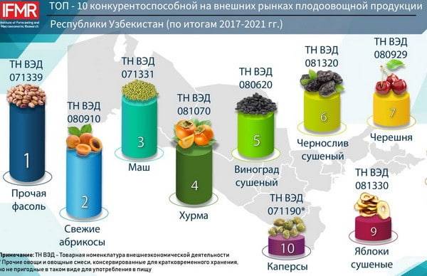 К ТОП 10 товаров с наибольшими сравнительными преимуществами на мировых рынках в период 2017-2021 гг. относятся: Прочая фасоль (vinga spp., phaseolus spp.) сушеная, лущенная, очищенная от семенной кожуры или неочищенная, колотая или неколотая (код ТНВЭД 071339); Свежие абрикосы (код ТНВЭД 080910); Фасоль видов vinga mungo (l.) нepper или vinga radiata(l.) Wilczek сушеная, лущеная, очищенная от семенной кожуры или неочищенная, колотая или неколотая (код ТНВЭД 071331); Хурма (код ТНВЭД 081070); Виноград сушеный (код ТНВЭД 080620); Чернослив сушеный (код ТНВЭД 081320); Черешня (код ТНВЭД 080929); Абрикосы сушеные (код ТНВЭД 081310); Яблоки сушеные (код ТНВЭД 081330); Прочие овощи и овощные смеси, консервированные для кратковременного хранения, но не пригодные в таком виде для употребления в пищу (код ТНВЭД 071190).