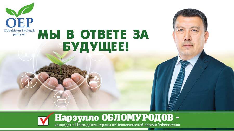 - В предвыборной программе кандидата в Президенты от Экологической партии Узбекистана Нарзулло Обломуродова предусмотрены поддержка последовательной реализации Стратегии по переходу Республики Узбекистан на «зеленую» экономику на период 2019-2030 годов, Концепции охраны окружающей среды Республики Узбекистан до 2030 года и других перспективных государственных программ, а также последовательное развитие науки, подготовка высококвалифицированных кадров, экологическая модернизация промышленной, транспортной, строительной и других сфер, обеспечение внедрения самых современных экологически чистых технологий.
