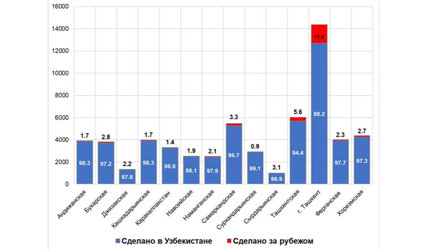 Регионами, в которых было продано больше всего иномарок стали г. Ташкент (11,8% новых автомобилей), Ташкентская (5,6%), Самаркандская (3,3%) и Хорезмская (2,7%) области.