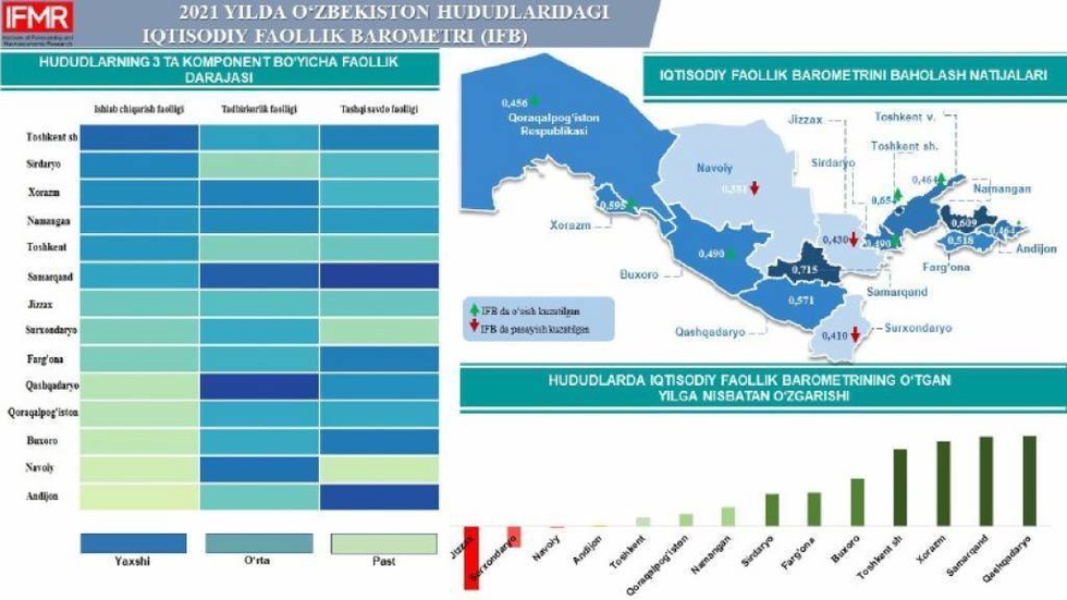 По результатам исследования, в 2021 году относительно благоприятная экономическая активность наблюдалась в городе Ташкенте, Самаркандской, Наманганской, Кашкадарьинской, Ферганской областях, сообщает УзА со ссылкой на пресс-службу института.