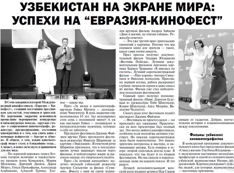 В конкурсной программе документального кино был представлен фильм «Смысл жизни» Улугбека Юлдашева - о заслуженном наставнике молодежи, профессоре и одной из основательниц узбекской журналистики Назире Абдуазизовой. Картина раскрывает судьбы людей, для которых журналистика - настоящее призвание.