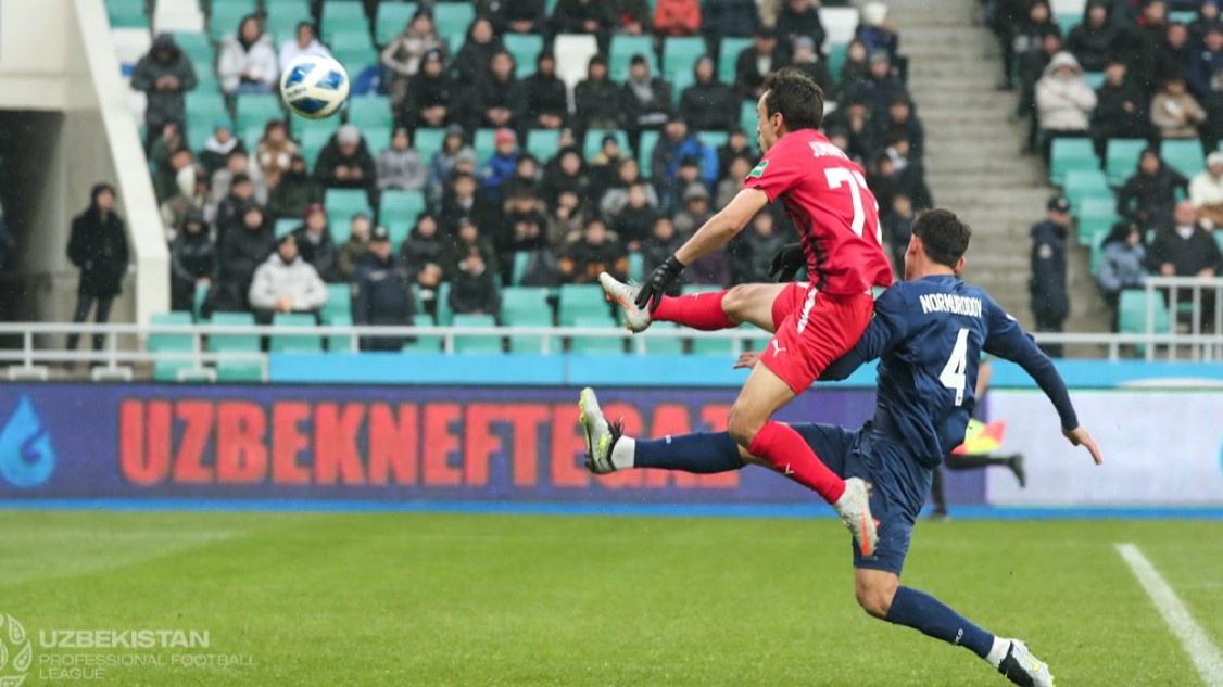 С углового Шахзодбек Рахматуллаев решил не подавать, а покатил в центр на Кухианидзе, который удобно навесил на голову Самандара Шукуруллаева.