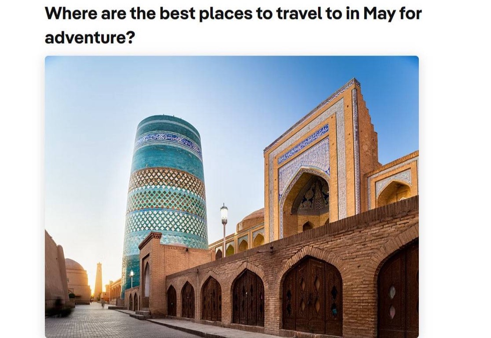 «При хорошей погоде посмотрите на Шелковый путь Караван-сараи. Шелковый путь. Специи. Есть что-то бесспорно романтическое в путешествии сюда, которое на протяжении тысячелетий было культурным сердцем Центральной Азии. В особенности это касается трех исторических городов Узбекистана - Самарканда, Бухары и Хивы, которые сверкают мозаичными мавзолеями, мечетями и медресе. «Фестиваль шелка и специй», который проходит в конце мая в Бухаре, известен изделиями ковроткачей, резчиков по дереву, музыкантов и художников. Действительно, май - идеальный месяц для посещения Узбекистана. Погода в стране создает удобные условия для прогулки по достопримечательностям, а тюльпаны и цветки абрикоса еще больше оживляют пейзаж».