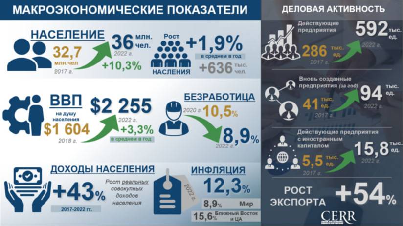 Благодаря реализации тысяч проектов, реализованных в отраслях экономики и регионах в сфере производства и услуг в 2017-2022 годах, ВВП на душу населения увеличился с 1604 долл. в 2018 году до 2255 долл. в 2022 году. Это создало основу для роста реальных доходов населения на 43% в 2017-2022 гг.