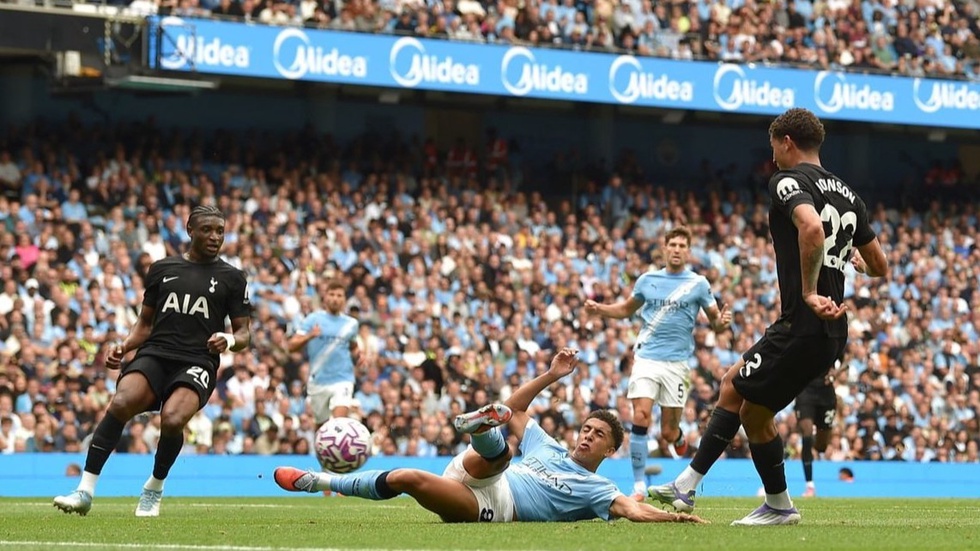 Ну, эти огрехи в атаке не столь огорчили, сколько невыход Хусанова на замену травмированному Аиту Нури. Вышел более опытный Натан Аке, однако это не спасло «горожан» от ошибок в обороне. После длинного выноса по флангу именно Аке проигрывает верх сенегальцу Папу Метар Сарру, тот делает сброс в сторону бразильца Ришарлисона, пролетевшему экспрессом по фланге и выкатившему прострел на Бреннана Джонсона. Помимо проигрыша верха здесь имела место позиционная ошибка при организации искусственного офсайда, в центре не хватило скорости для подстраховки Рико Льюису. Не хочу принизить талант англичанина, но стартовая скорость Хусанова выше.