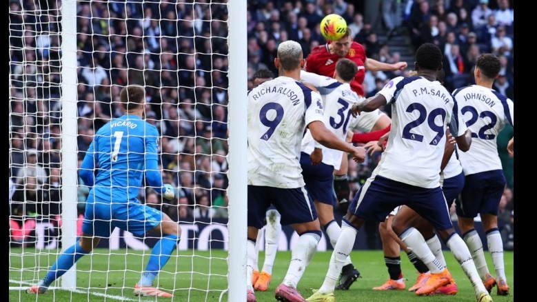 И все-таки гости затолкали мяч в ворота «шпор», после серии рикошетов мяч прилетел в ноги Амада Диалло. Тот навесил во вратарскую, где головой забил камерунец Брайан Мбёмо. Все началось с неудачного выноса мяча Кристианом Ромеро. Он угодил мячом в голову Бруну Фернандешу, от которой мяч прилетел в ноги Патрику Доргу. Навес датчанина не смог обратить в гол неудачным ударом головой Мбёмо, мяч завис в воздухе, когда упал в ноги Диалло со второй попытки Мбёмо справился с задачей.