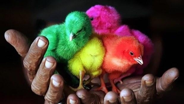 Wikipedia повествует о традиции красить цыплят, причем мужскую особь. Метода вроде как два: через шприц вводить краситель в яйцо, а потом подкладывать наседке, или окрашивать уже родившихся цыплят в таре с краской, от чего цыплятам плохо (кто-то умирает сразу, кто-то выживает). Цель продавцов - финансовая выгода, а родители помогают ее осуществить.