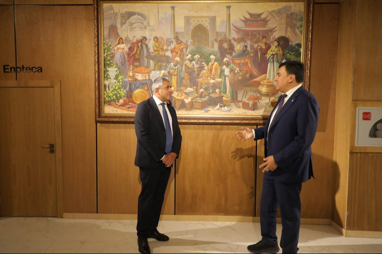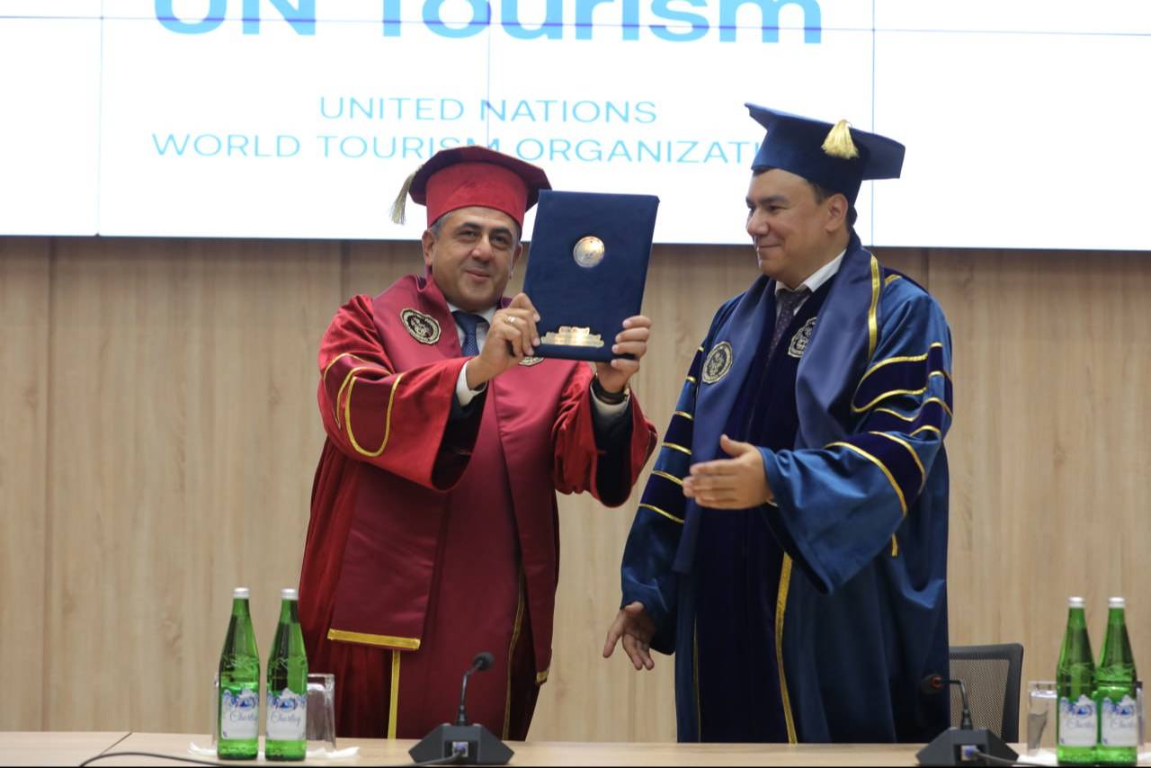 В рамках визита в Международном университете туризма и культурного наследия «Шелковый путь» состоялось торжественное мероприятие, в ходе которого министр экологии и ректор университета Азиз Абдухакимов вручил Генеральному секретарю ООН Туризм Зурабу Пололикашвили звание почетного профессора университета.