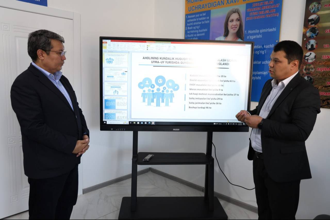 Кроме того, А.Ташкулов посетил ряд махаллей Навбахорского и Карманинского районов и оценил эффективность реализации программ правового просвещения, таких как «Адлия куни» и «Хукукий таргибот куни», а также деятельность «махаллинской семерки», ответственной за решение правовых и социальных вопросов граждан.