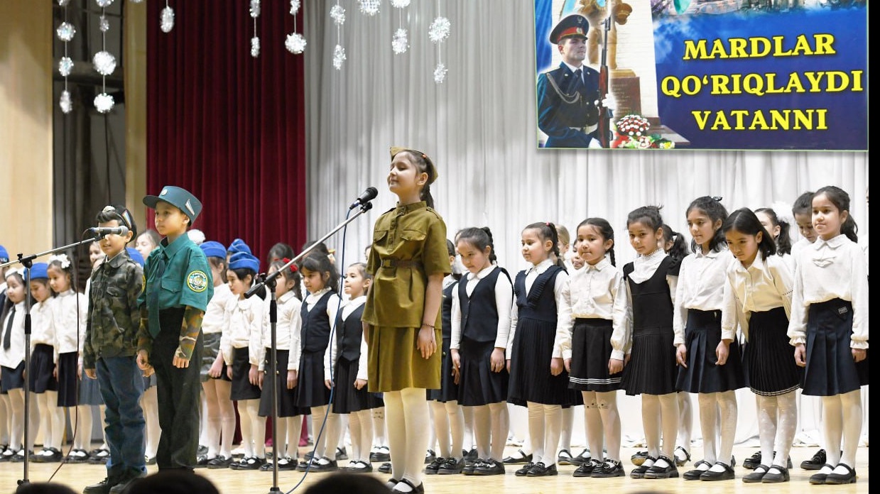 Всегда трудно выступать первым, но ученикам четвертого класса Хандомиру Икрамову и Хошимжону Бахромову удалось справиться с песней «Защитники Отечества» на «отлично».