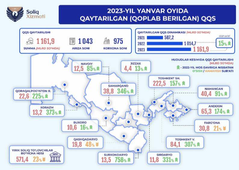 Как сообщает Государственный налоговый комитет РУз, по сравнению с аналогичным периодом прошлого года сумма возмещенного НДС выше на 147,3 млрд сумов.