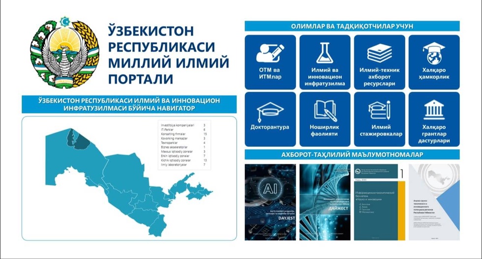 На портале в виде интерактивной карты включен навигатор Научно-инновационной инфраструктуры Республики Узбекистан с базой данных 62 отраслевых организаций.