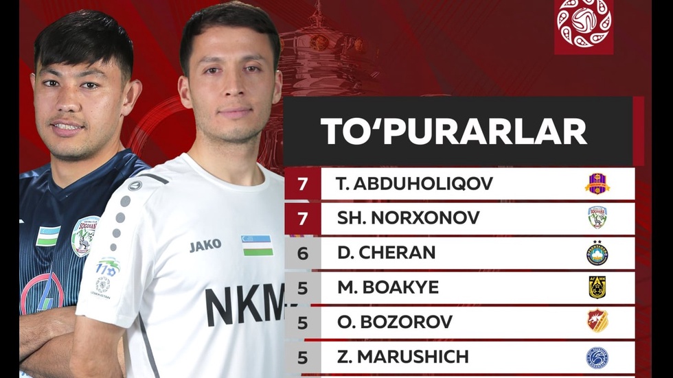 Пока в споре бомбардиров лидируют Темурхужа Абдухоликов и Шохруз Норхонов, у них по 7 голов, у Драгана Черана 6 мячей, сразу восемь игроков имеют в активе по 5 забитых мячей.