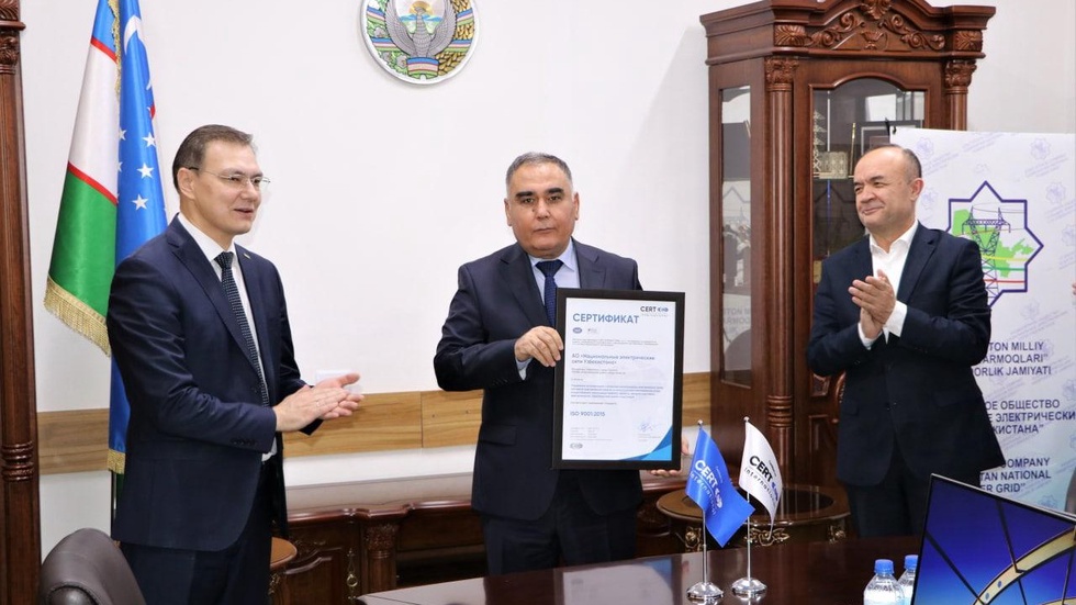 Представитель Международной организации по сертификации Риад Ибрагимов вручил Председателю правления АО «НЭС Узбекистана» международный сертификат и пожелал успехов в дальнейшей работе «Национальных электрических сетей Узбекистана», играющих стратегически важную роль в энергетическом секторе, особенно в электроэнергетике.