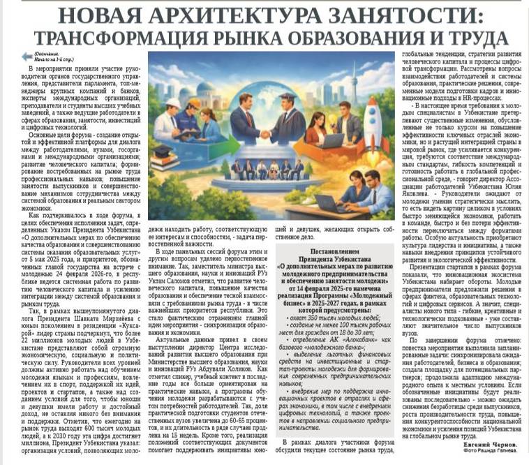 По завершении форума отмечено: повестка мероприятия выполнила запланированные задачи: синхронизировала ожидания работодателей, бизнеса и образования; создала площадку для потенциальных партнеров; продолжила адаптацию международного опыта к местным условиям. Если обозначенные инициативы будут реализованы последовательно - можно ожидать снижения безработицы среди выпускников, роста производительности труда, повышения конкурентоспособности национальной экономики и усиления позиций Узбекистана на глобальном рынке труда.