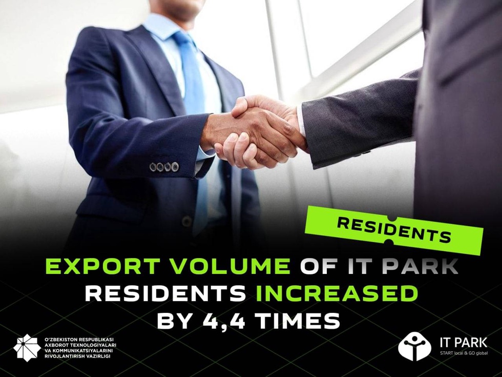Объем экспорта резидентов IT Park по сравнению с прошлым аналогичным периодом также увеличился - на 4,4 раза и составил 53,2 млн долл. США. При этом, 88% экспорта резидентов приходится на США, остальные на Великобританию, Германию, СНГ и ОАЭ. Ожидается, что к концу 2022 года объем экспорта достигнет 100 млн долл. США