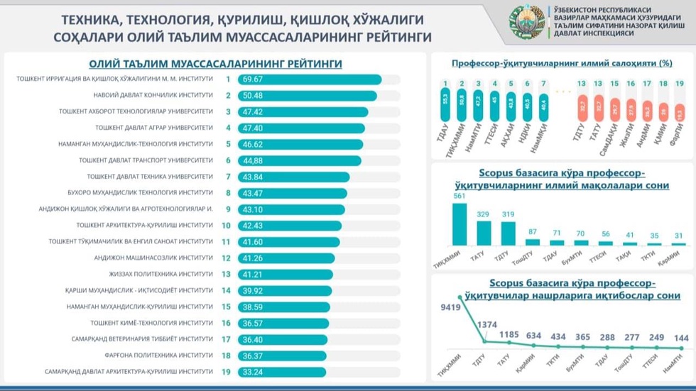 В ТОП-10 вошли также Ташкентский государственный университет узбекского языка и литературы, Международная исламская академия Узбекистана, Ташкентский государственный университет востоковедения, Навоийский государственный горный институт, Бухарский государственный медицинский институт. С ним в рейтинге Ферганский политехнический институт, Денауский институт предпринимательства и педагогики, Джизакский государственный педагогический институт, Каракалпакский медицинский институт, Кокандский государственный педагогический институт, Нукусский государственный педагогический институт, Самаркандский государственный архитектурно-строительный институт и Навоийский государственный педагогический институт.