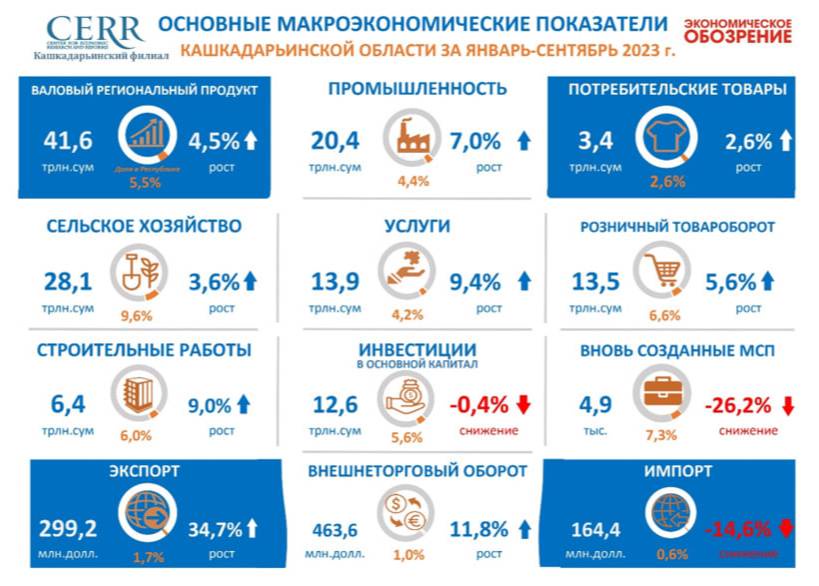 Кашкадарьинская область заняла 4-е место среди регионов по объему производства продукции сельского, лесного и рыбного хозяйства (28,1 трлн сумов) с долей по республике 9,6%.
