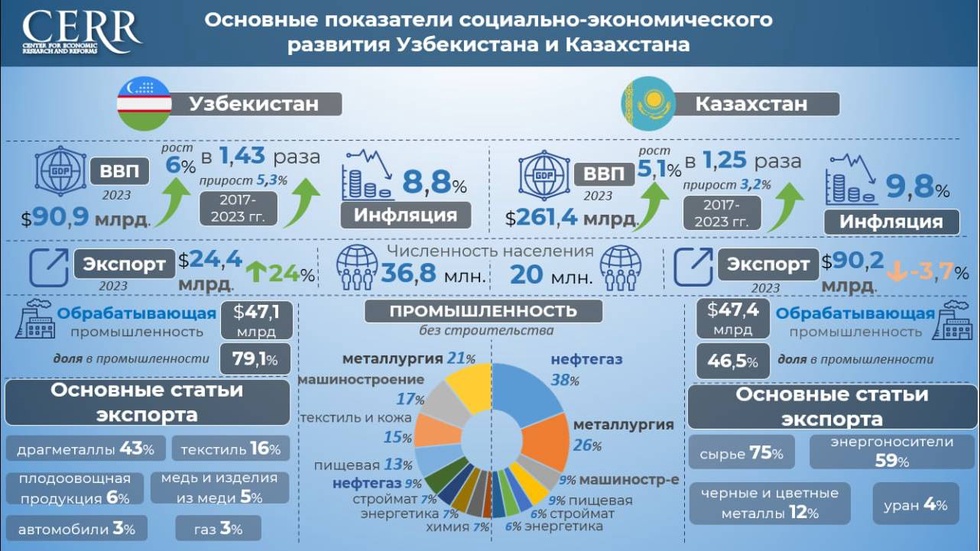 Минувший год оказался достаточно благоприятным для промышленной индустрии двух стран. Если в 2023 году доля промышленности в ВВП Узбекистана, без учета строительства, составила 26,1%, то Казахстана - 26,5%.