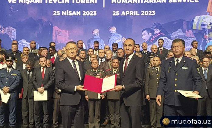 На церемонии вице-президент Турции Фуат Октай вручил памятные знаки военному атташе Посольства Узбекистана в Турции Шухрату Икрамову и представителю МЧС полковнику Исмаилу Шарипову, и особо отметил заслуги узбекских военнослужащих, проявивших самоотверженность и трудолюбие в ходе спасательных и поисковых работ.