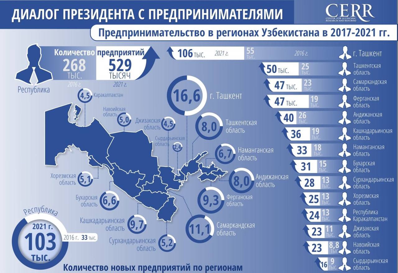 За 2016-2021 годы ВВП Узбекистана увеличился на 24 процента, а объем промышленного производства - на 34. Положительные эффекты прослеживаются в экономических индикаторах, таких как Индекс деловой активности (ИДА) и Индекс бизнес-климата, внедренного по методологии аналога Индекса бизнес-климата института ИФО в Германии. Так, в июне текущего года ИДА в регионах и столице по сравнению с предыдущим месяцем увеличился на 6,2 процента. Среднегодовой сводный индикатор в 2021-м составил 60 пунктов (что на 18 пунктов больше по сравнению с 2020 годом), что оценивает состояние бизнес-климата в стране как положительное.