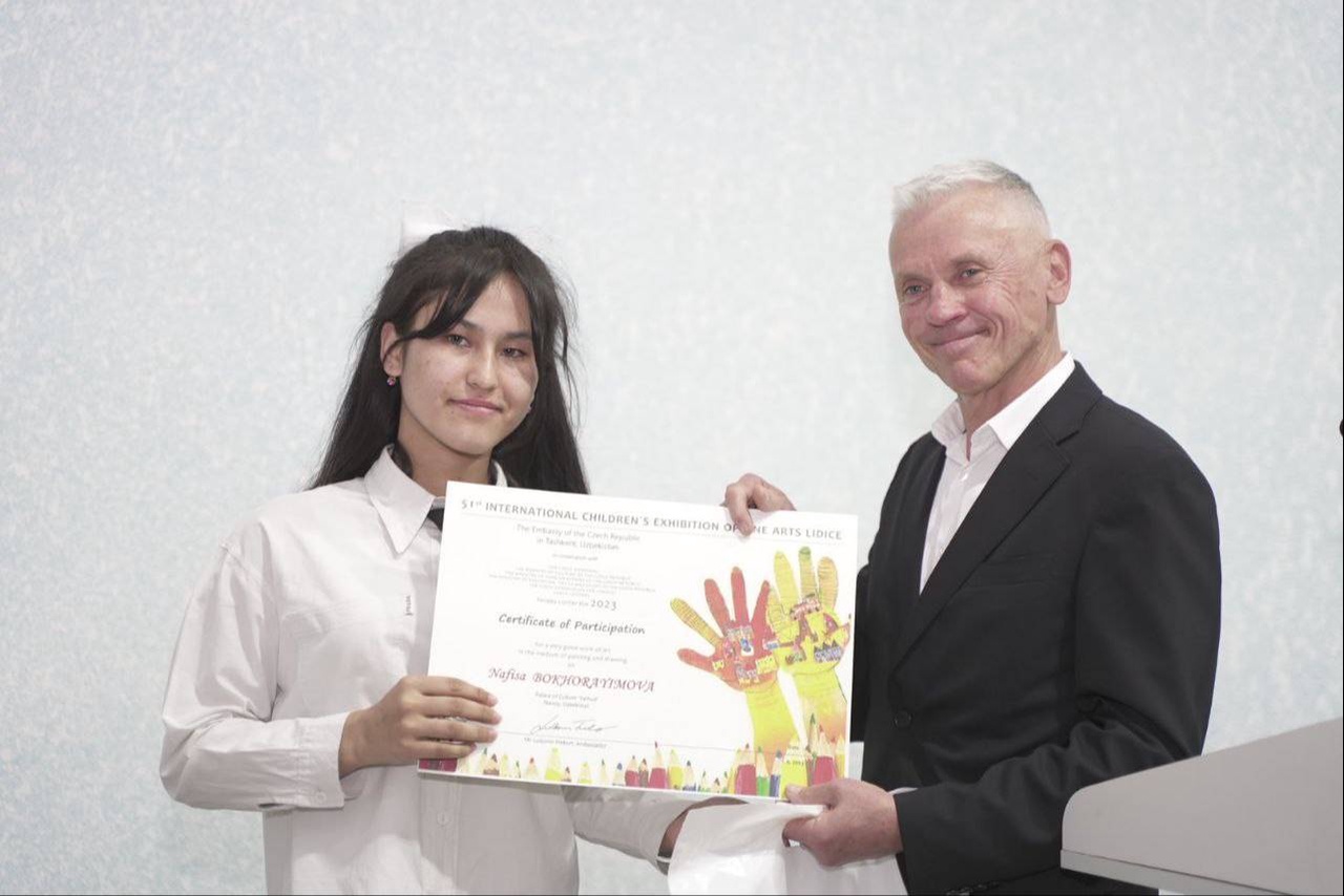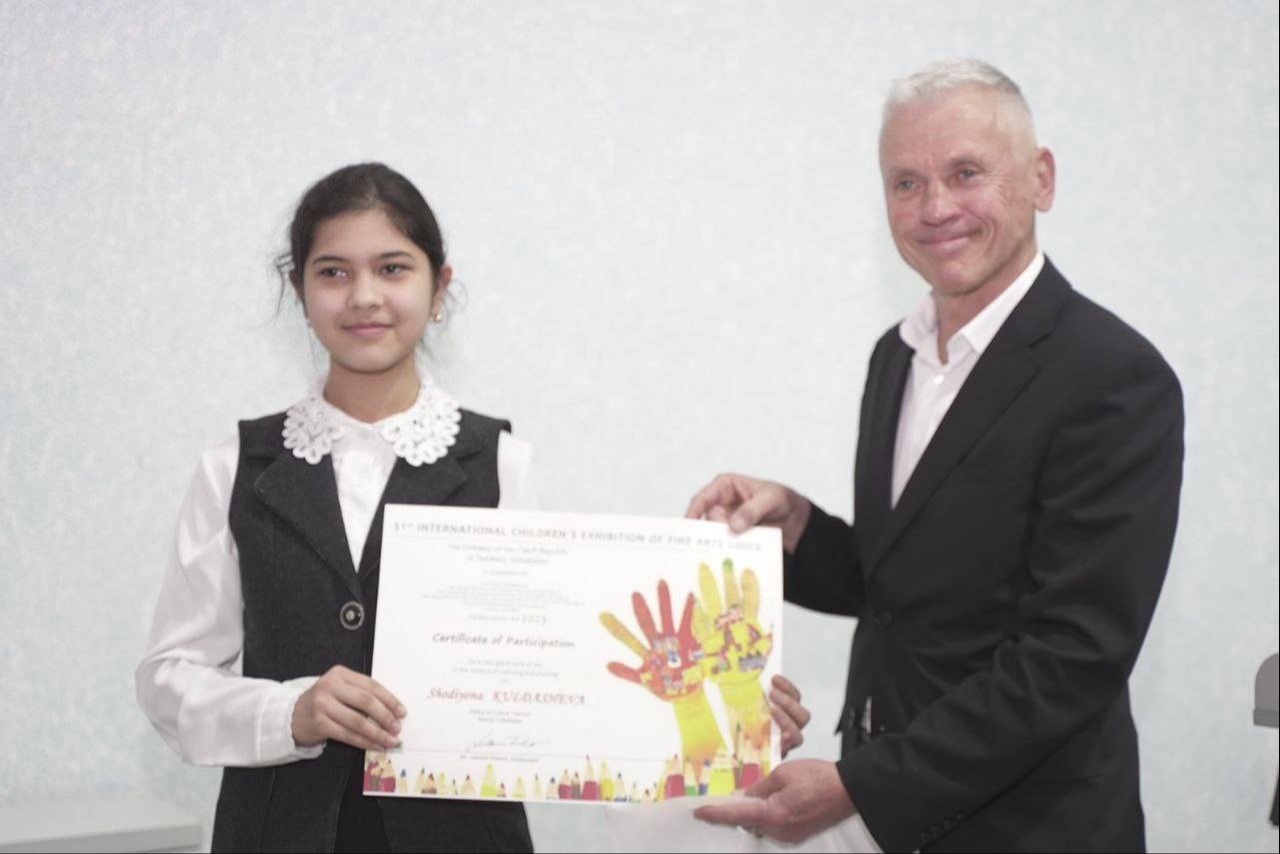 В частности, глава дипломатического корпуса вручил сертификаты и сувениры участникам Студии изобразительного искусства ДК «Фархад» Амире Салимовой, Амирхану Ахмедову, Нафисе Бахораймовой и Шодиене Кулдашовой. Ребята принимали участие в 51-й Международной выставке детского творчества «Lidice 2023», состоявшейся в Чехии, и вошли в число победителей.