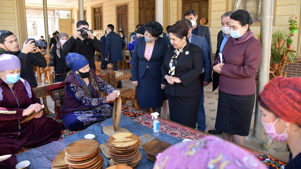 После этого состоялось ознакомление с ремесленничеством в доме мастера Бехзода Мадраимова, живущего в махалле «Нов». Примечательно, что этот предприниматель обеспечил работой 18 женщин. Кроме того, 19 учеников мастера обучаются по традиции «наставник - ученик». Продукция этого предпринимателя, в основном, создана ручным трудом, она широко распространена и покупается в Саудовской Аравии.