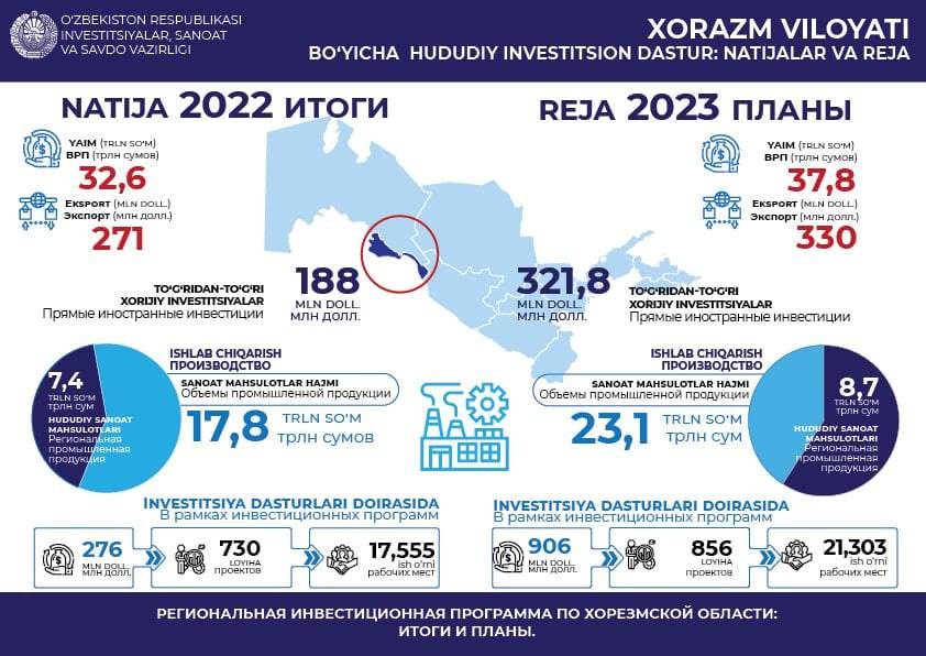 Прогнозы на 2023 год следующие. Так, в текущем году запланировано произвести промышленной продукции на сумму 23,1 трлн сумов, увеличить экспорт до 330 млн долларов, в результате привлечения инвестиций на сумму 811,4 млн долларов в 2023 году в Хорезмской области планируется реализовать 850 инвестиционных проектах и создать более 20 500 новых рабочих мест.