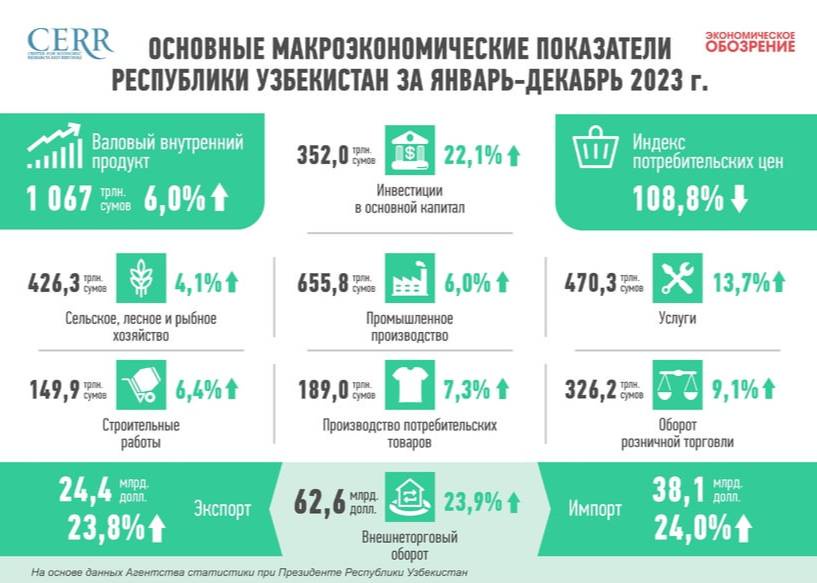 В целом, в 2023 г., несмотря на внутренние и внешние вызовы, экономика Узбекистана продемонстрировала устойчивость и высокие темпы роста. В прошедшем году удалось вернуть двузначную динамику инвестиционной активности, замедлить рост цен, во всех секторах экономики выросло производство.