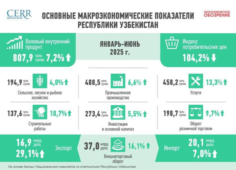 В целом, в первом полугодии 2025 года экономика Узбекистана демонстрирует уверенное восстановление и структурную устойчивость. Активная инвестиционная и внешнеэкономическая политика, поддержка реального сектора и снижение инфляционного давления обеспечивают позитивную макроэкономическую динамику.