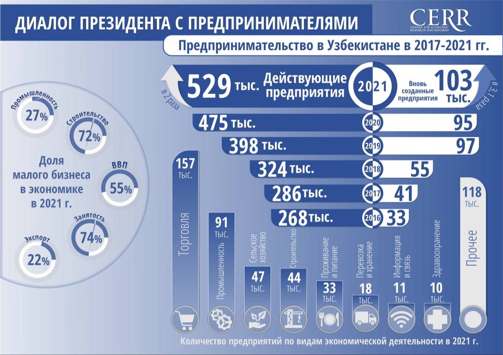 Несмотря на сложности, испытанные малым бизнесом во время пандемии, предпринимательство демонстрирует впечатляющие темпы развития. Так, если в 2016 году число действующих предприятий насчитывало 268 тысяч, то в 2021-м - 529 тысяч (рост в 2 раза). Если в 2016 году число вновь созданных предприятий составляло около 33 тысяч, в 2021-м их стало более 103 тысяч (рост в 3,1 раза). Как отметил Президент в ходе встречи с представителями бизнеса, число предпринимателей за последние 5 лет утроилось и в настоящий момент составляет 1,5 млн человек, а на предприятиях частного сектора работает около 5 млн человек.