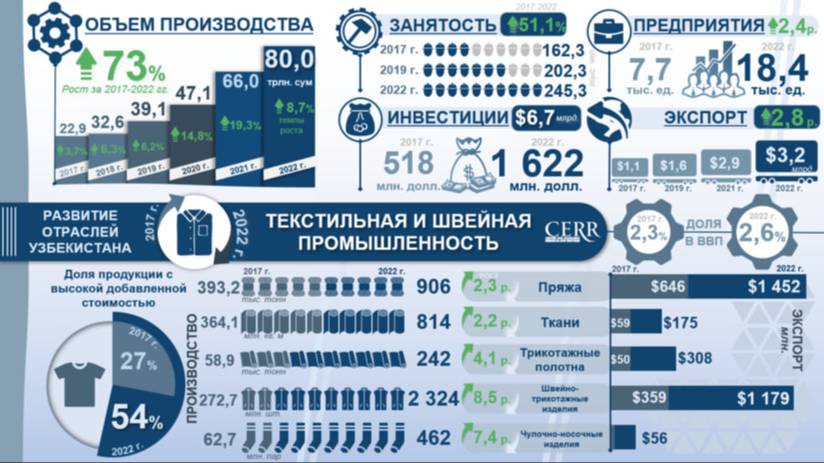 В 2017-2022 гг. в текстильной отрасли отмечается позитивная динамика по всем направлениям. Так, за 6 лет объем производства отрасли вырос на 73%. Значительно увеличились объемы производства товаров текстильной и швейно-трикотажной отраслей. Объем производства пряжи вырос в 2,3 раза (с 393 тыс. тонн в 2017 г. до 906 тыс. тонн в 2022 г.), тканей в 2,2 раза (с 364 до 814 млн кв. м), трикотажного полотна в 4,1 раза (с 59 до 242 тыс. тонн), швейно-трикотажных изделий в 8,5 раза (с 273 до 2 324 млн шт.), чулочно-носочных изделий в 7,4 раза (с 63 до 462 млн пар). Доля продукции с высокой добавленной стоимостью в объеме производства текстильной отрасли увеличилась с 27% в 2017 г. до 54% в 2022 г.