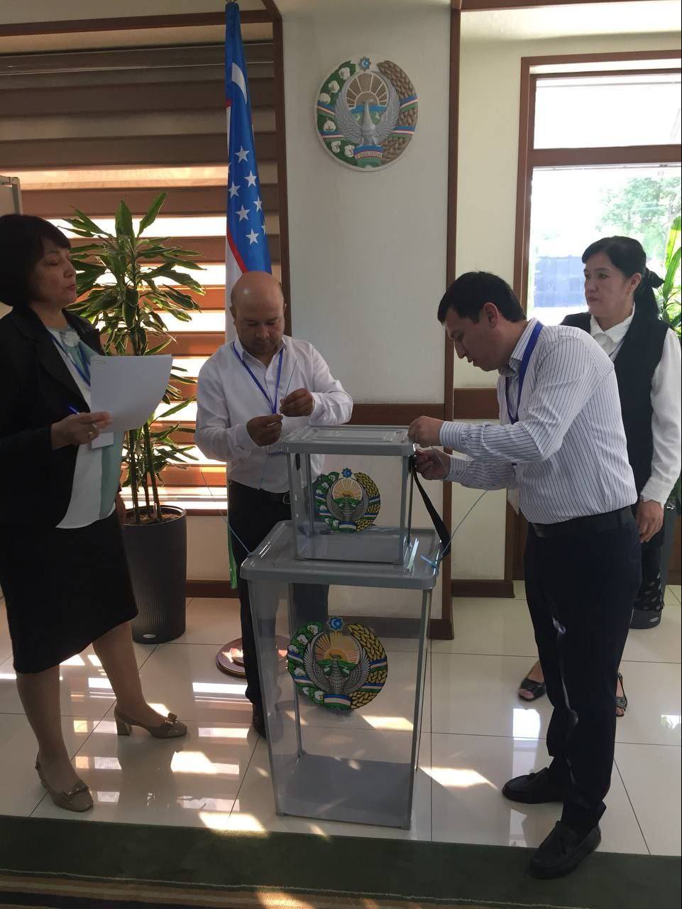 Координатор мониторинговой группы, белорусский сенатор Сергей Рачков и заместитель руководителя Секретариата Совета МПА СНГ - директор Международного института мониторинга развития демократии Иван Мушкет посетили участок № 115 в здании Ташкентского городского Совета УзЛиДеП.