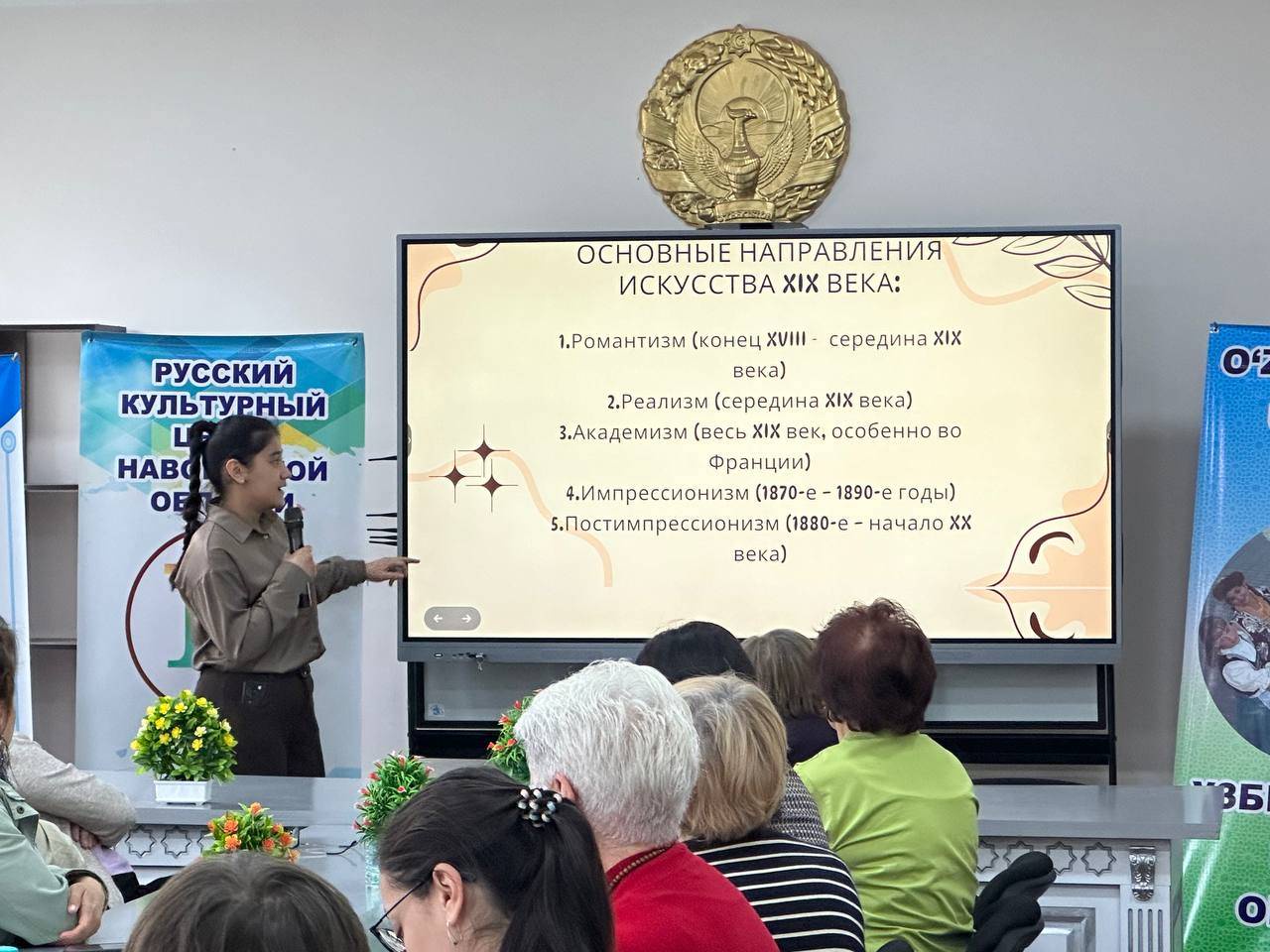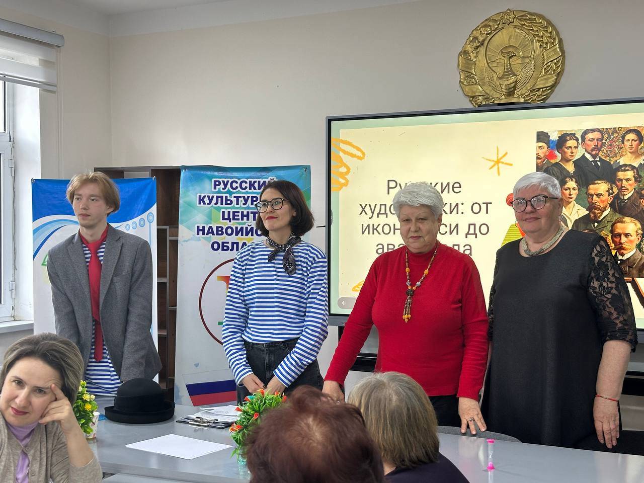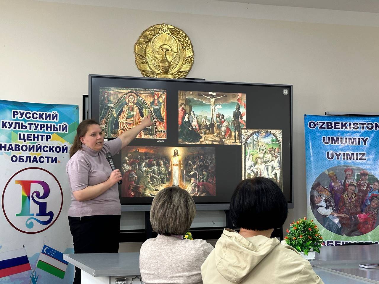 Об истории иконописи рассказала гостям учитель русского языка и литературы общеобразовательной школы № 4 города Навои Ирина Пирогова, ученицы 10-го класса данного учебного заведения Тамара Максудова и Амина Икромова - об истории искусства и основных его направлениях в XVII - XIX веках.