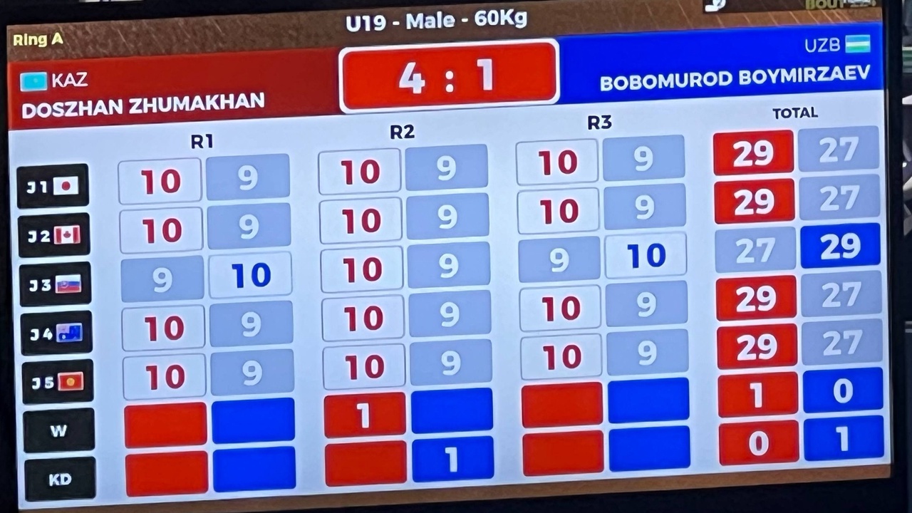 К сожалению, Бобомурод Боймирзаев (-60 кг) проиграл Досжану Жумахану из Казахстана (1:4) и выбыл из турнира. При этом во втором раунде наш боксер пропустил прямой левой в голову и рефери в ринге отсчитал нокдаун. Бой с левшой тем и труден, что прямой левой проходит жестко. Весь третий раунд Бобомурод гонялся по рингу за соперником, но не догнал…