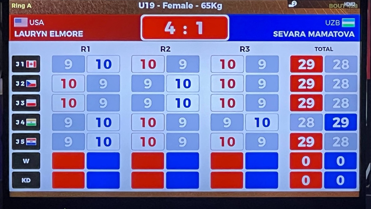 Сначала Назокат Мардонова (-51 кг) проиграла вчистую индианке Чандрике Пужари (0:5), следом и Севаре Маматовой (-65 кг) не удалось победить Лаурин Элморе из США (1:4).