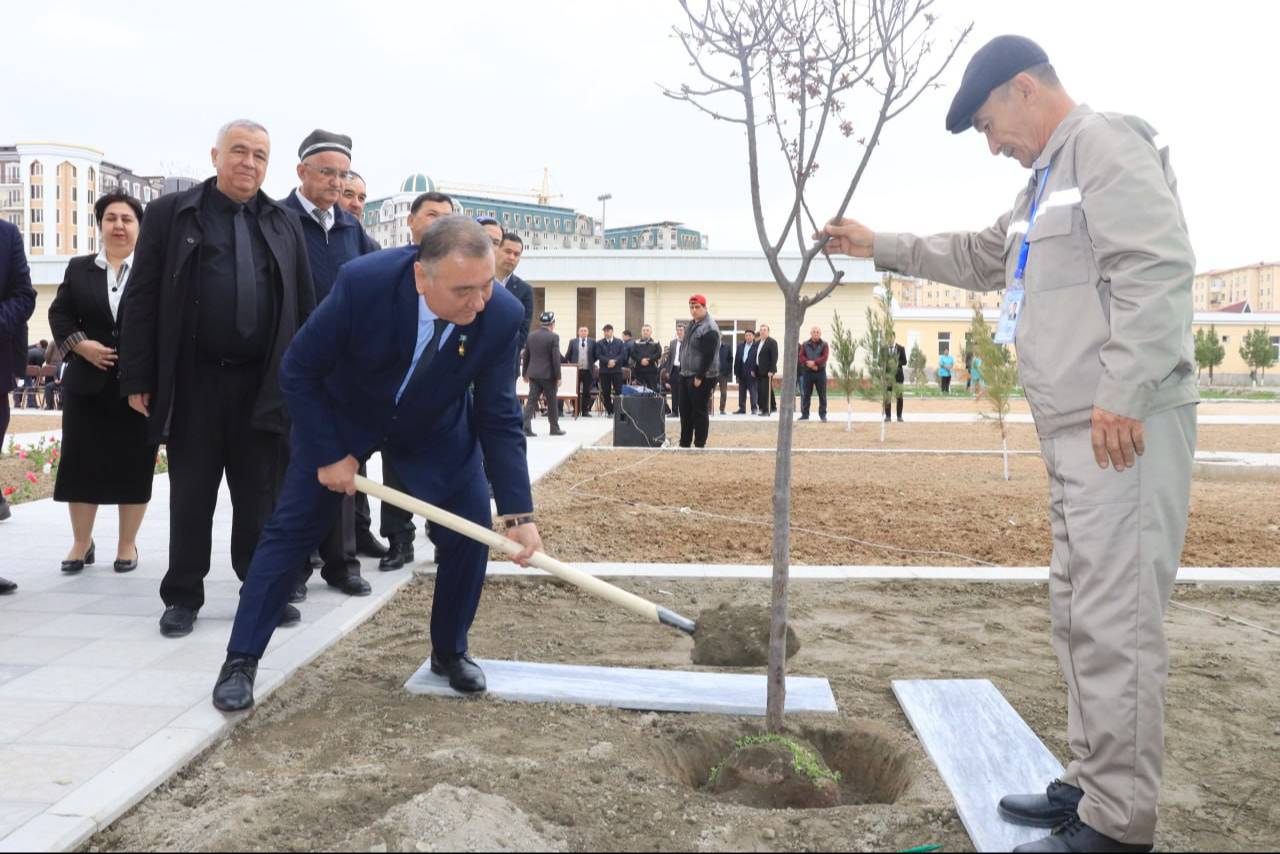 Перед входом в здание для знакомства гости мероприятия, в числе которых Председатель правления - генеральный директор АО «НГМК» Кувандик Санакулов, посадили деревья во дворе студенческого общежития.