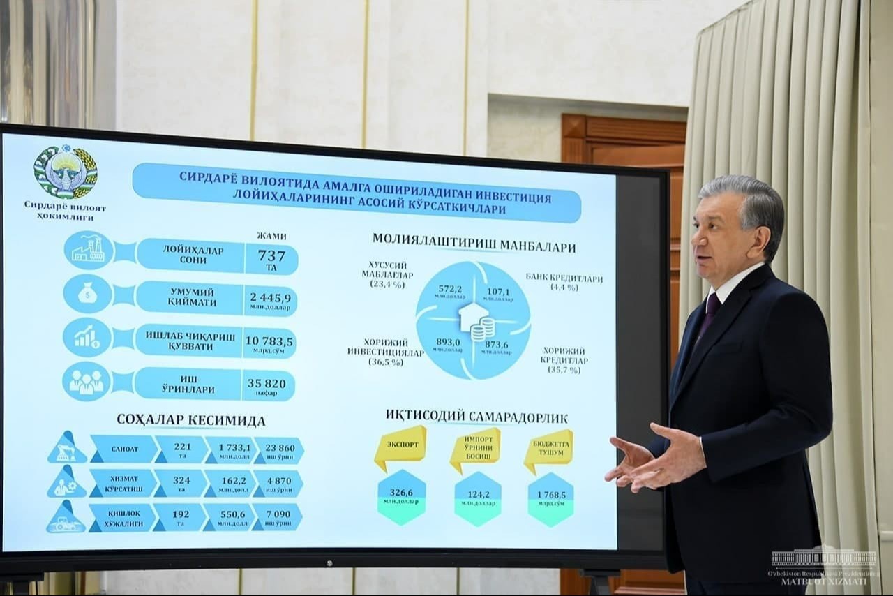 Глава государства дал указания по качественной и своевременной реализации проектов, увеличению выпуска импортозамещающей продукции. Он отметил необходимость развития логистики и расширения партнерства с соседними государствами, выгодно используя близость Сырдарьинской области к городу Ташкенту и развитость железнодорожной инфраструктуры.