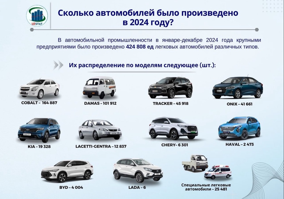 По данным Агентства статистики, в автомобильной промышленности в январе-декабре 2024 года крупными предприятиями было произведено 424 808 ед легковых автомобилей различных типов.