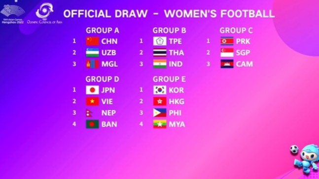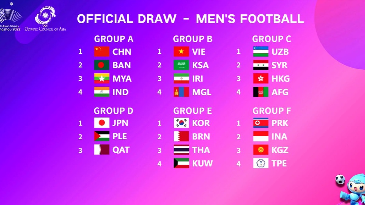 Итоги жеребьевки в мужском футболе: группа A - Китай, Бангладеш, Мьянма, Индия, группа B - Вьетнам, Саудовская Аравия, Иран, Монголия, группа C - Узбекистан, Сирия, Гонконг, Афганистан, группа D - Япония, Палестина, Катар, группа E - Южная Корея, Бахрейн, Таиланд, Кувейт, группа F - Северная Корея, Индонезия, Кыргызстан, Тайпей.